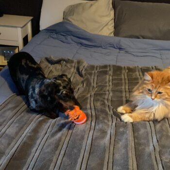My little poodle loves this interactive ball! It's like having a playmate that never gets tired. The chirping bird sound stimulates his curiosity and the two long tails are perfect for tugging games.