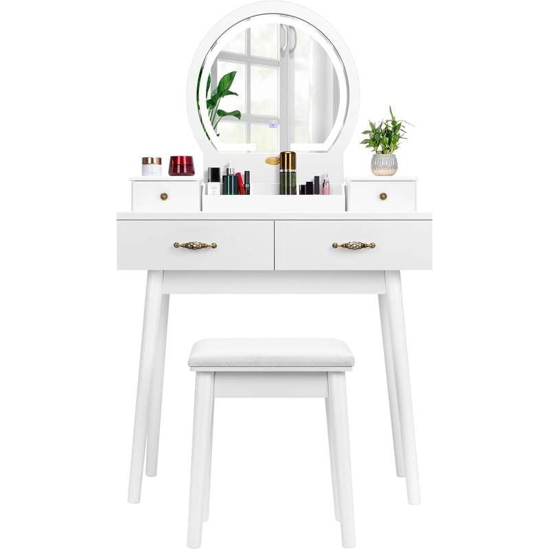 Well, let me tell you something. This vanity set? It's a total game changer. I mean it, folks! The first thing that caught my eye and made my heart skip a beat was the lighted mirror. Now, we're not talking about ordinary mirror here. Nah, this one comes with color options - yes you heard right! Imagine getting ready in the morning orpping for a night out and having the perfect lighting to do your makeup no matter what time of day is! No more squing in dim light trying to see if your foundation matches your neck or wondering if you've blended your eyeshadow enough. No sirree! With this bad boy, every little detail is illuminated so there's no room for error. And trust me when I say it has totally transformed my makeup routine! 💄💋 Before I got this vanity set, doing my makeup felt like such a chore but now? It feels like an indulgence; almost therapeutic even! Each time I sit down at it, I feel like a Hollywood starlet getting ready for her close up. And those color options on the mirror are just icing on the cake. Whether you want warm tones to recreate golden hour vibes or cool tones for that soft daylight look – they've got 'em all covered! So yeah guys...this vanity set isn't just amazing - it's beyond words fabulous!